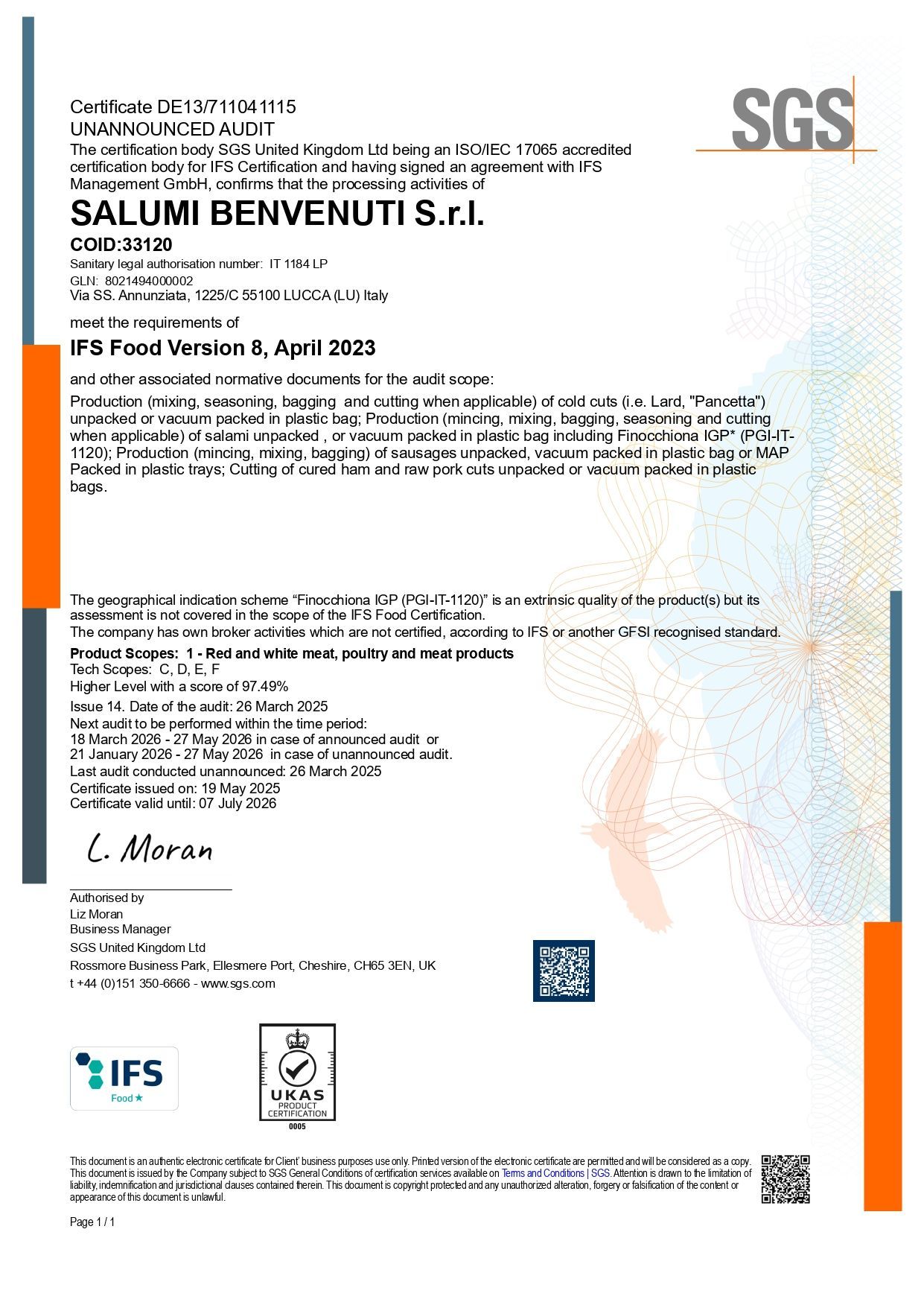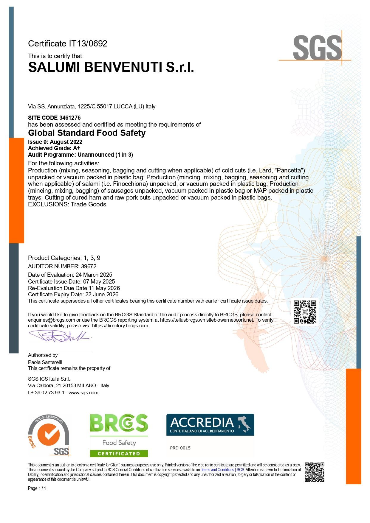 certificazione per il mondo anglosassone BRC British Retail Council per Global Standard for Food Safety in data 7 Maggio 2025 con la massima valutazione e scadenza il 22 Giugno 2026. Un importante riconoscimento della moderna struttura produttiva e del rispetto delle più avanzate procedure nella produzione di salumi.